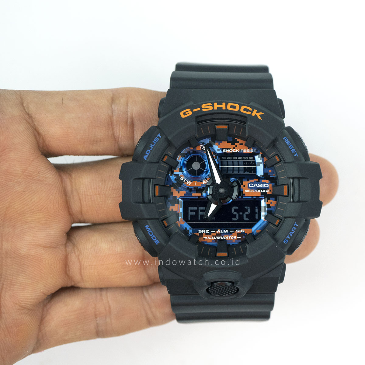 Dan walaupun mendapatkan 2 warna cerah yaiti biru dan orange pada bagian dial, sebenarnya model G-Shock GA-700CT-1A ini sendiri dominan berwarna hitam.