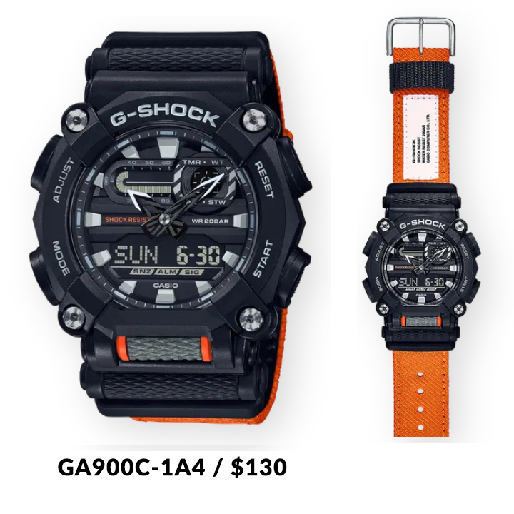 Varian kedua yaitu GA-900C-1A4 hadir dengan warna yang lebih keren, karena kalau dilihat dari depan memang hampir keseluruhannya hitam nih guys, termasuk warna LCD hitam ( negative). Untuk tali jam sendiri menggunakan bahas kanvas berwarna orange yang kece badai nih guys.