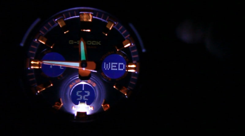 Lampu LED untuk muka jam (Lampu LED otomatis penuh, Super iluminator, durasi iluminasi yang dapat dipilih (1,5 detik atau 3 detik), berpijar)