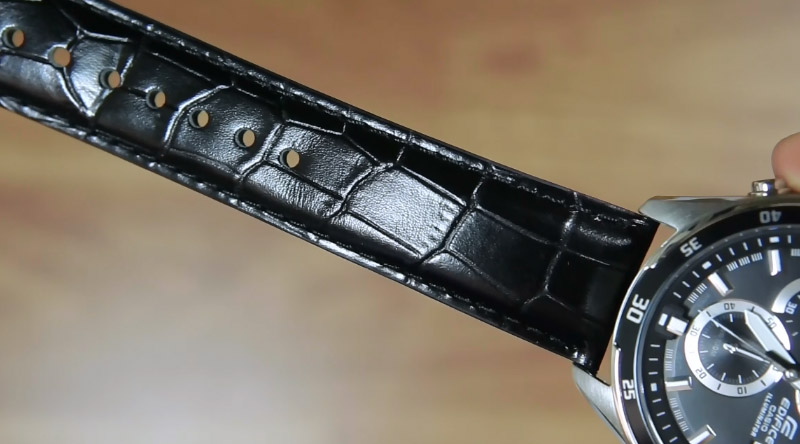 Tali kulit ( leather band ) asli pada jam Casio Edifice EFR-547L-1AV ini memiliki motif sisik ular yang cukup besar dengan finishing semi glossy yang akan berubah seiring dengan pemakaian.