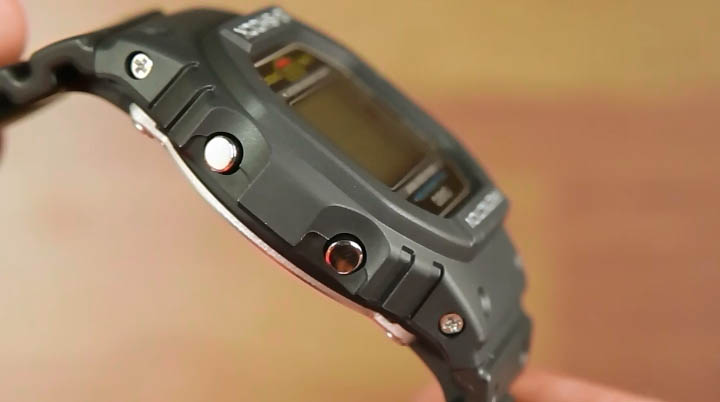 Salah satu ciri khas dari jam Casio G-Shock DW-5600E-1 ini adalah tombol dengan ion plated dengan finishing berwarna hitam. Tombol yang terbilang sangat “cebol” ini memang terlihat sangat kecil dan hampir sejajar dengan case dari jam ini. Terutama tombol adjust yang malahan sedikit terbenam kedalam, perlu extra kerja keras bagi kami untuk membiasakan diri dalam menekan tombol tersebut.