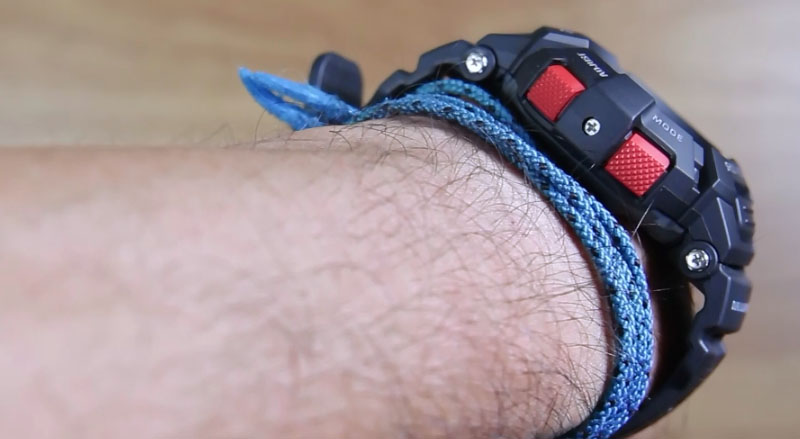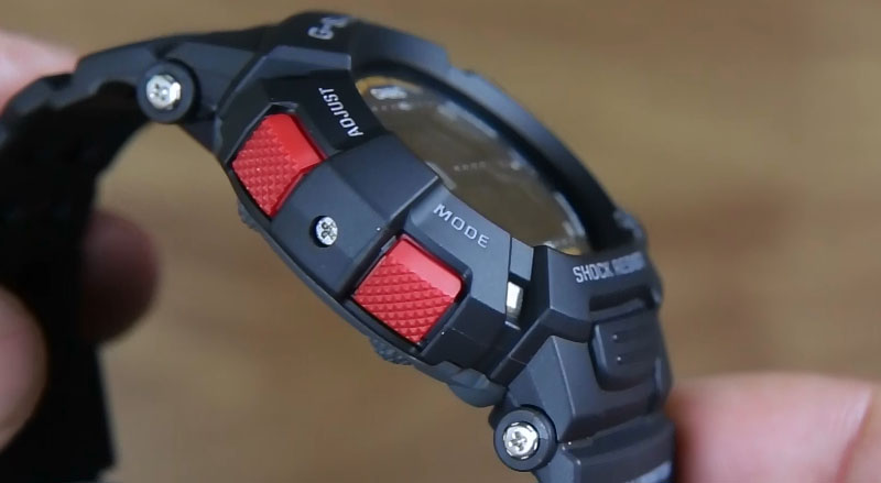 Perpaduan warna hitam pada mayoritas jam ini dengan tombol merah pada kedua sisi sebenarnya memberikan nuansa yang segar pada jam ini. Dengan tombol yang cukup besar dan memiliki pattern anti slip, warna merah memang sangat menonjolkan keberadaan dari tombol-tombol tersebut.
