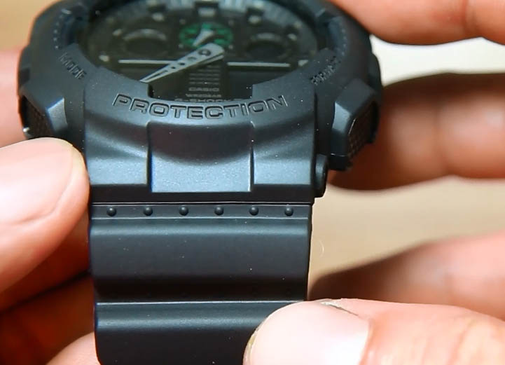 Sayang sekali tombol yang digunakan pada jam Casio G-Shock GA-100MB-1A ini sedikit masuk dari bezel jam ini. Bagi Anda yang memiliki jari tangan yang sedikit besar harus sedikit membiasakan diri pada saat menekan tombol-tombol tersebut. Apalagi saat Anda harus menekan tombol tersebut untuk waktu 3-5 detik. Namun kami temukan seiring waktu, jari Anda akan terbiasa.