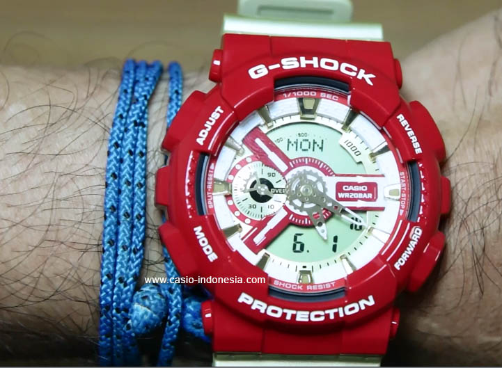 Bagi Anda penggemar super heroes iron man tentu sangat familiar dengan kombinasi warna dari jam Casio G-shock GA-110CS-4 ini. Yah kombinasi warna merah dan warna emas yang memang sangat lekat dengan karakter dari iron man, menghiasi jam Casio G-shock GA-110CS-4 ini.