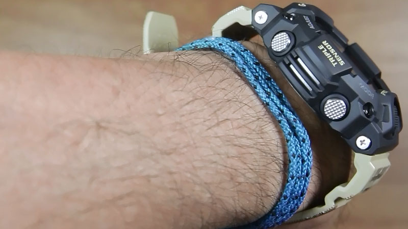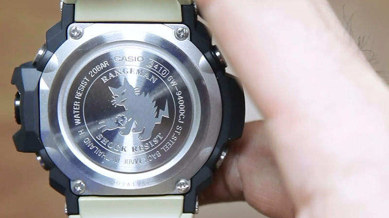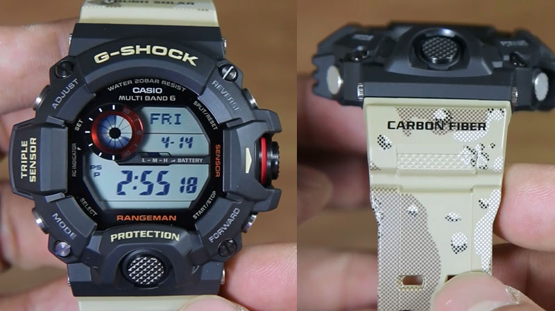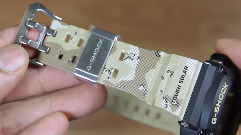 Warna dan motif kamuflase gurun pasir memang menjadi daya tarik utama dari seri Casio G-Shock Rangeman GW-9400DCJ-1 ini. Warna ini memang identik dengan warna yang digunakan oleh tentara yang melakukan aktivitas di gurun pasir untuk keperluan kamuflase. Bagian resin band ini semakin terlihat gagah dengan kombinasi buckle yang terbuat dari bahan stainless steel. Kami mencoba melakukan test pada resin band jam Casio G-Shock Rangeman GW-9400DCJ-1 ini dan hasilnya ternyata sangat memuaskan baik dari segi kenyamanan saat di pakai maupun ketahanannya.
