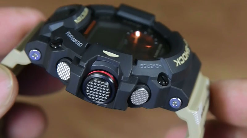 Dilihat dari samping atau sisi kanan dari jam Casio G-Shock Rangeman GW-9400DCJ-1, terlihat jelas 3 tombol yang cukup besar terutama pada tombol tengah jam ini. Lupakan tombol tradisional yang kecil dan polos, Rangeman GW-9400 ini menghadirkan tombol stainless steel yang sangat nyaman dilihat maupun di tekan. Dengan pattern bergerigi yang menambah kokohnya desain jam ini, dan sekaligus memberikan tombol yang sangat gampang di tekan.