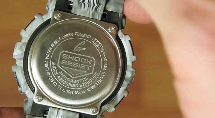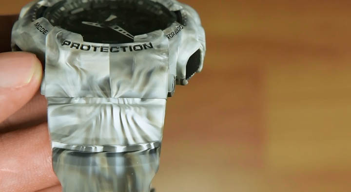 Resin band pada jam Casio G-shock GA-100MM-8A ini menjadi salah satu senjata utama untuk memikat para pecinta warna unik, dengan desain marmer berwarna abu-abu jam ini memang memberikan “rasa” yang baru bagi pemakainya.