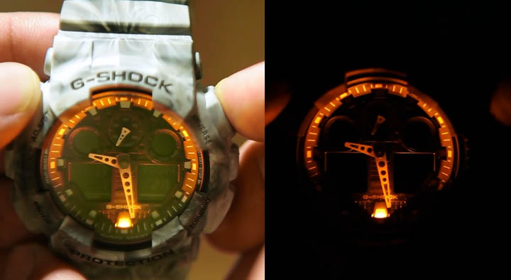 Untuk lampu pada jam Casio G-shock GA-100MM-8A ini meskipun kami merasa sedikit kesulitan dalam membaca semua data yang tertera pada saat kondisi sangat gelap, namun untuk posisi jam sendiri masih terlihat cukup jelas.