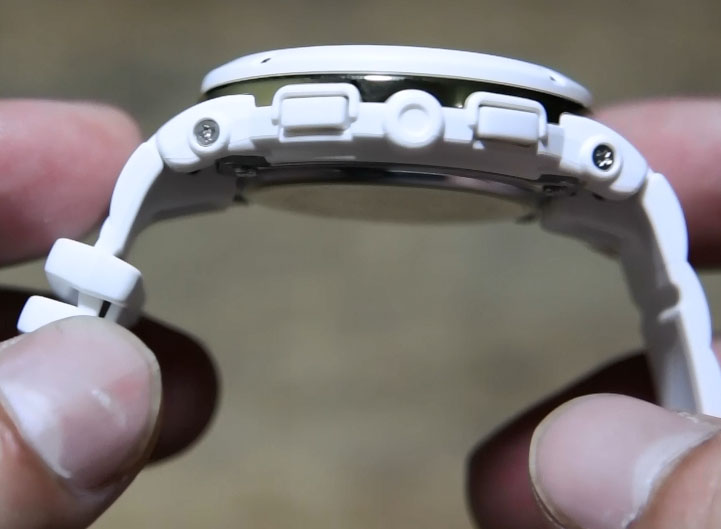 Pada kedua sisi jam Casio Baby-G BGA-151-7B ini sendiri diberikan masing-masing 2 tombol berwarna putih juga. Namun sayangnya kedua tombol tersebut cukup kecil, sehingga butuh adaptasi agar terbiasa dengan tombol tersebut. Satu hal yang cukup keren adanya 1 ring stainless yang memisahkan antara bezel dengan bagian utama ( mesin ) dari jam ini yang mirip dengan hamburger.