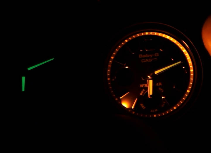 Jarum jam pada jam BGA-151 ini sendiri bisa nyala ( illumination ) pada kegelapan apabila mendapatkan cahaya sebelumnya, dan ditambah dengan lampu LED kuning yang bisa Anda tekan sewaktu-waktu di butuhkan. Sayang sekali untuk bagian LCD cukup gelap dan hampir tidak mendapatkan cahaya dari lampu LED tersebut.
