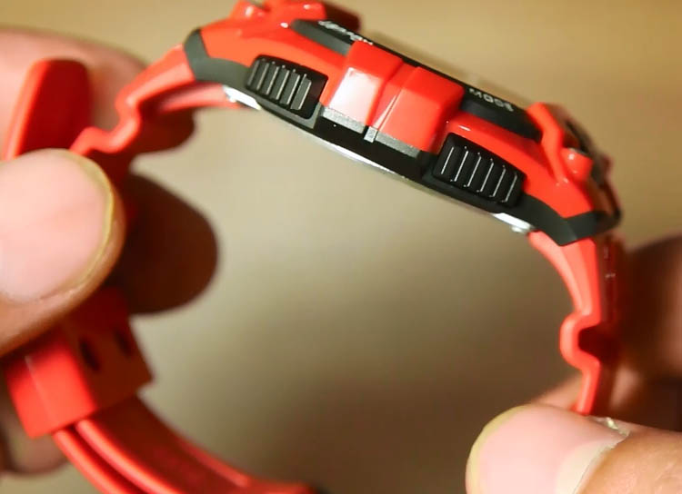 Pada sisi kiri terlihat 2 tombol anti slip dengan bahan resin yang memiliki format lazimnya jam casio lain yaitu posisi tombol adjust di atas tombol mode. Untuk melakukan adjustment, Anda dapat menekan tombol adjust ini selama beberapa detik dan kemudian memulai settingan Anda mulai dari tanggal, waktu dan tahun serta settingan lainnya sesuai fitur jam ini.