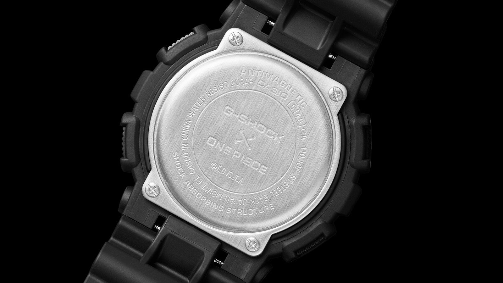 Casing penutup belakang juga tidak luput dari nuansa one piece, dengan menampilkan logo G-SHOCK X ONE PIECE. Namun sebenarnya kami mengharapkan lebih misalnya dengan finishing metal hitam, bukan standard seperti biasanya.