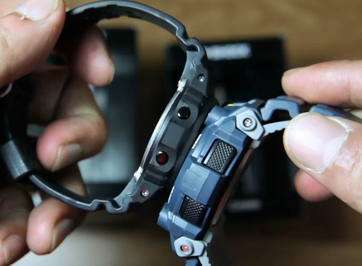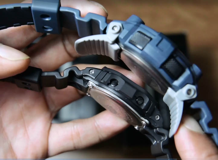 Jika kita lihat dari kedua sisi jam G-shock ini, kembali kita menemukan perbedaan besar antara kedua jam “best seller” ini. Dengan tema “vintage”, Casio DW-5600MS tetap konsisten memberikan nuansa jadul dengan tombol kecil dan bulat pada kedua sisi jam tersebut. Sedangkan G-shock G-7900 telah mendapatkan 4 tombol besar yang memang terlihat sangat modern.