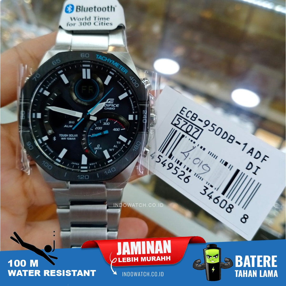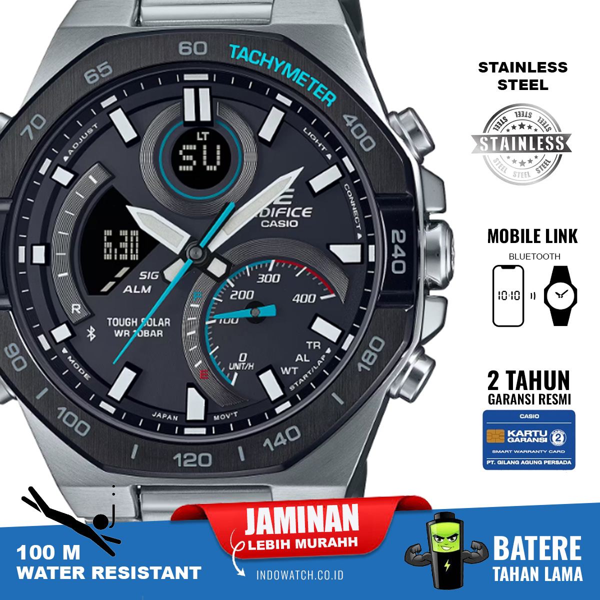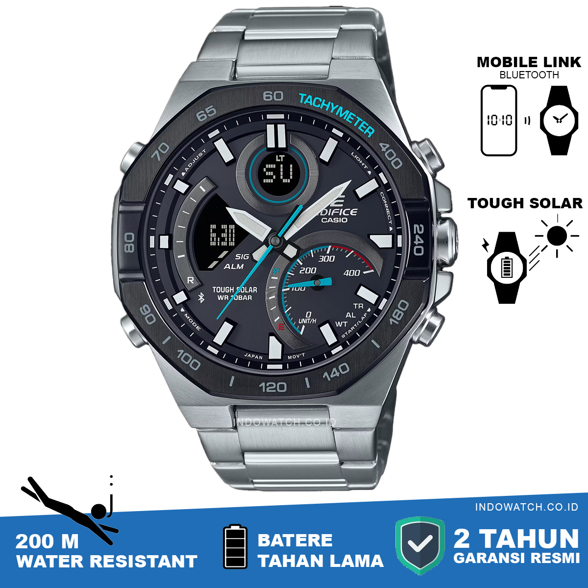 Dapatkan konektivitas smartphone dan masih banyak lagi dalam jam tangan EDIFICE kombinasi analog-digital, yang dibuat untuk memproyeksikan kecepatan dan kecerdasan. Desain yang berani dan canggih dilengkapi dengan bezel oktagonal yang menggambarkan garis-garis alat mekanik mobil balap. Selain tampil memukau, jam tangan ini menghadirkan fungsi yang lengkap sehingga Anda bisa mendapatkan semua informasi yang diperlukan pada jarum jam yang mudah dibaca dan LCD. Sinkronkan dengan smartphone melalui Bluetooth® untuk mendapatkan informasi yang akurat. Kapan pun, di mana pun. Cukup ketuk aplikasi untuk dengan mudah mengelola fungsi seperti memilih satu kota dari daftar Waktu Dunia. Dial sisipan besar di posisi pukul 4 meningkatkan indikator kecepatan yang menampilkan kecepatan rata-rata ketika mengukur waktu putaran untuk jarak tertentu. Lampu LED yang sepenuhnya otomatis menerangi dial dan layar LCD dengan hanya memiringkan pergelangan tangan Anda. Tough Solar mengisi daya jam tangan menggunakan cahaya matahari atau bahkan lampu neon.