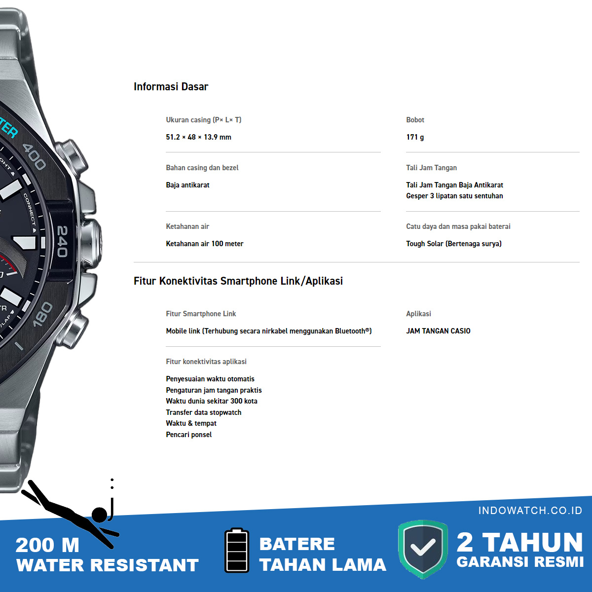Penyesuaian waktu otomatisPengaturan jam tangan praktisWaktu dunia sekitar 300 kotaTransfer data stopwatchWaktu & tempatPencari ponsel