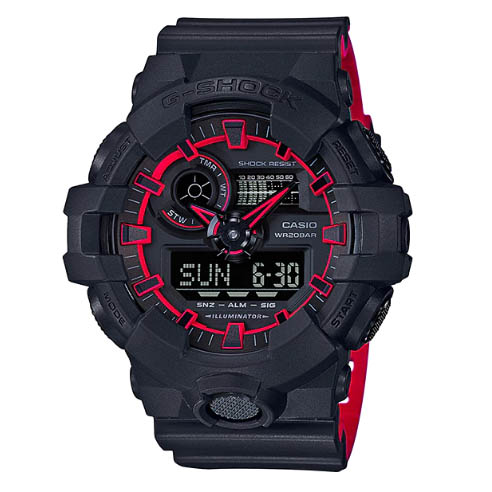 Casio G-shock GA-700SE-1A4 ini hadir dengan warna hitam doff yang terlihat sangat gagah dan elegan yang membungkus bagian dial dan LCD, yang kemudian diberikan sedikit aksen berwarna merah pada lingkar luar dial dan jarum penunjuk waktunya. Dibagian LCD inilah berbagai data dan fitur jam ini akan ditampilkan seperti waktu dunia, alarm, timer, stopwatch serta penanggalan maupun waktu digital. Dan sebagai penunjuk waktu utama, jarum jam dan menit analog yang menjadi pemeran utama pada jam ini.