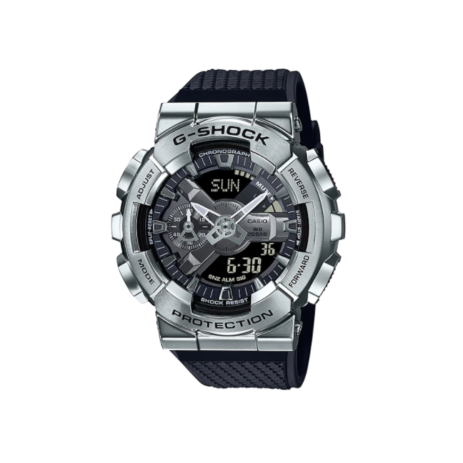 Bezel baja tahan karat pada model Seri GM-110 analog-digital ini ditempa, dipotong, dan dipoles secara khusus untuk menghasilkan desain yang istimewa. Model GM-110 memiliki bezel dan dial berwarna perak untuk menghasilkan tampilan metalik.Spesifikasi