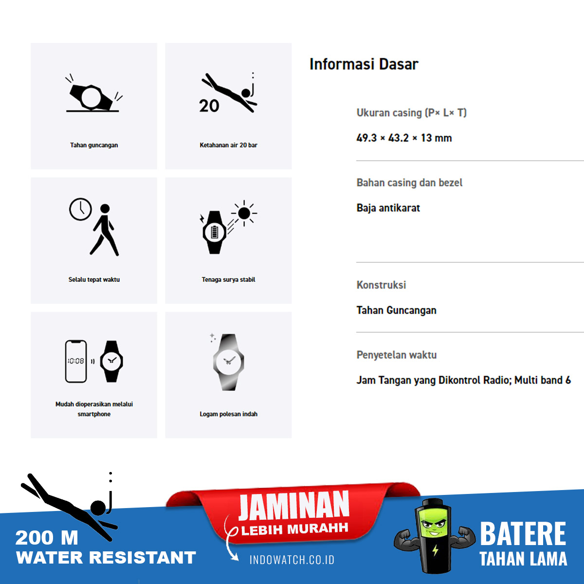 • Multiband 6 (Mendukung penyesuaian pengaturan waktu secara otomatis berdasarkan salah satu dari enam sinyal kalibrasi waktu di seluruh dunia: Jepang (2), Tiongkok, Amerika Serikat, Inggris, Jerman.)
