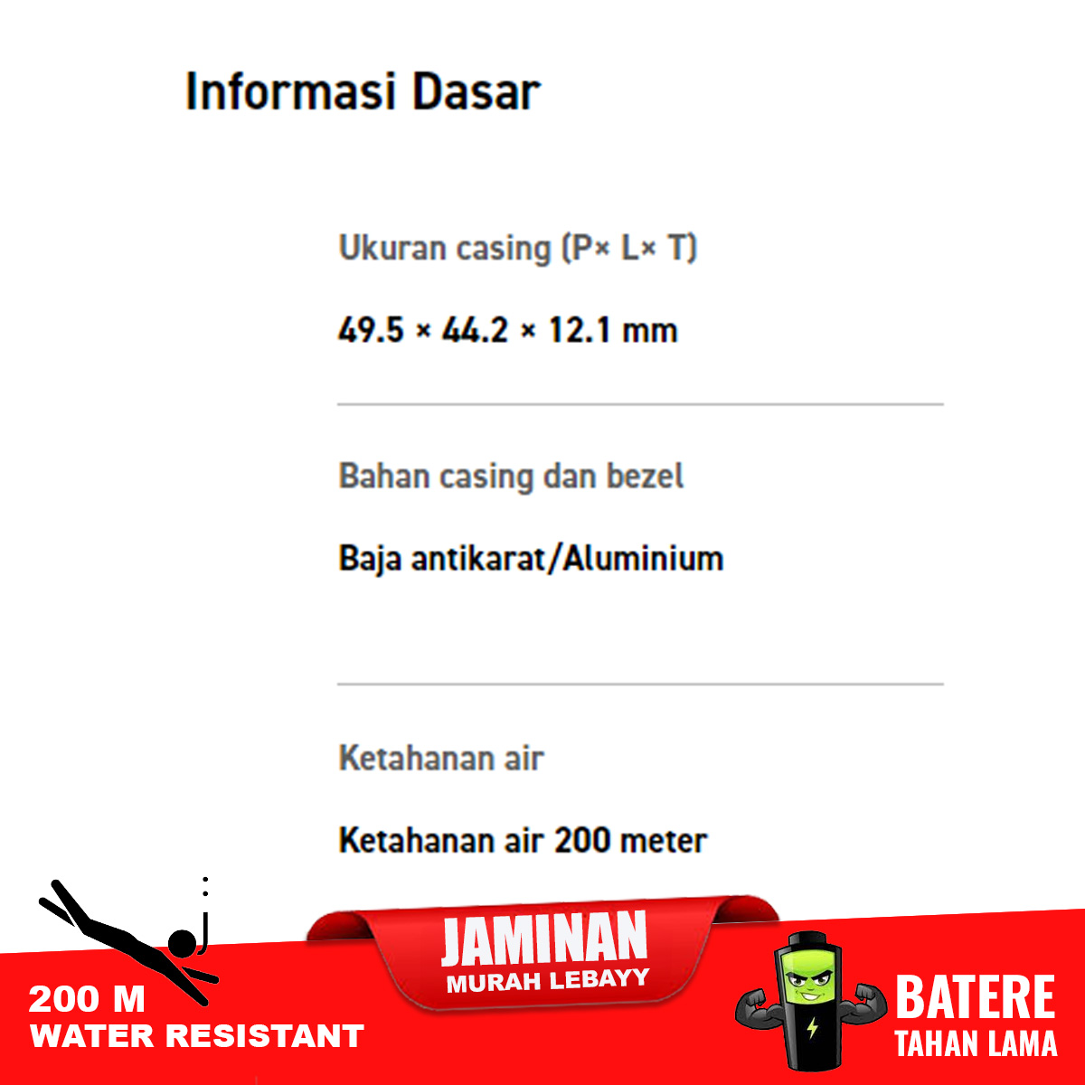 Ketahanan air 200 meterCatu daya dan masa pakai baterai