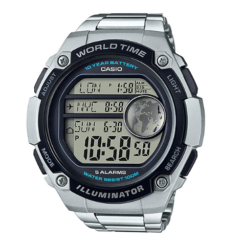 31 zona waktu (48 kota + waktu universal terkoordinasi, 3 kota tambahan yang dikonfigurasi pengguna), waktu musim panas aktif/nonaktif, pertukaran kota Asal/kota Waktu dunia, tampilan serentak waktu 3 kota - Stopwatch 1/100 detik
