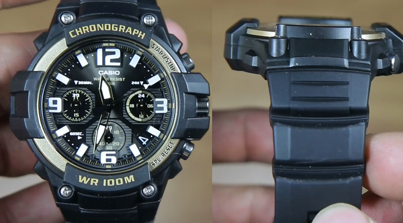 Analog: 3 hands (hour, minute, second), 3 dials (stopwatch minutes, stopwatch seconds, 24-hour) - Accuracy: ±20 seconds per month