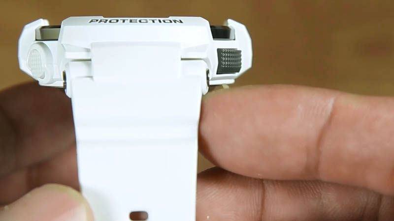 Penggunaan tombol bulat dengan bagian permukaan anti selip menjadi standard dari model Casio Baby-G BGA-210-7B1 ini. Dengan tombol yang sedikit menjorok kedalam ( tenggelam ), terlihat casio memang mempersiapkan jam ini agar lebih tahan terhadap benturan.