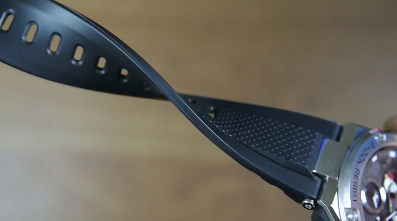 Tidak ada perlakuan khusus yang diberikan oleh casio pada bagian resin band pada jam G-shock GST-B100-1A ini, secara umum resin band ini terlihat sama dengan tipe pendahulunya. Hanya saja finishing pada bagian resin band ini terlihat lebih soft dibandingkan dengan seri GST-S100G misalnya. keseluruhan resin band ini juga dibalut dengan warna hitam solid yang terlihat sangat serasi dengan bagian utama dari jam ini.