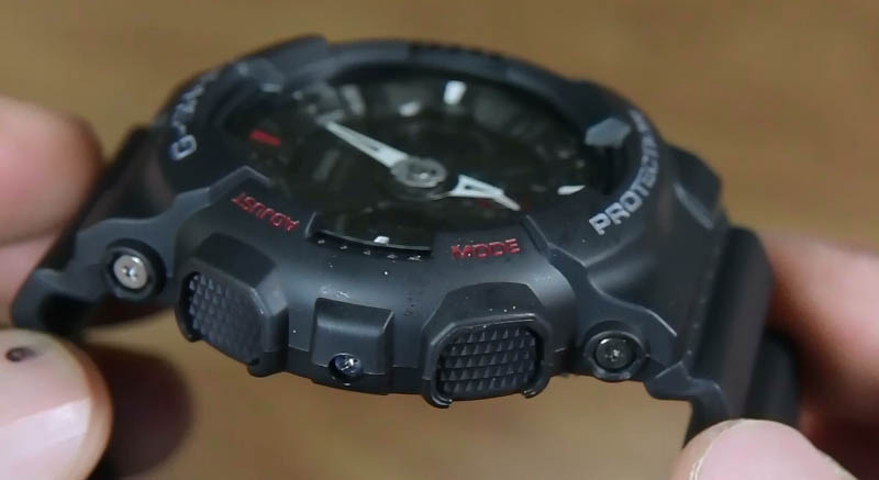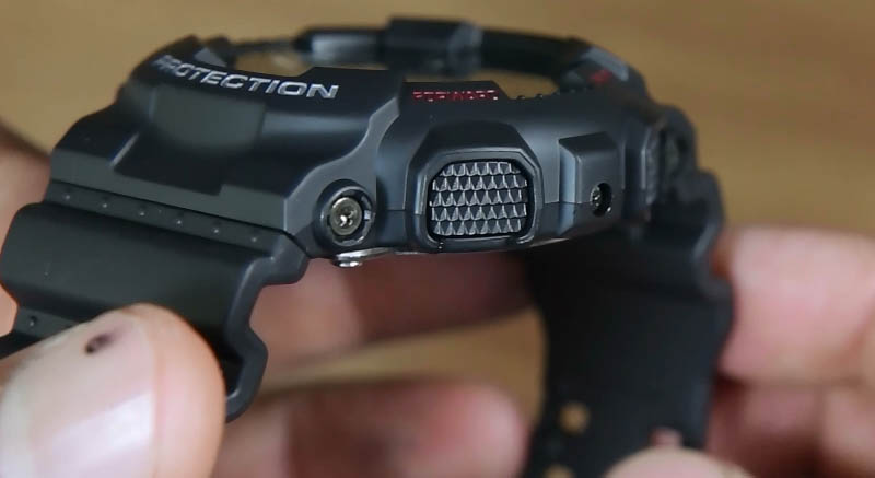 Kembali pada jam Casio G-Shock GA-120-1A ini, melihat dari sisi kanan dan kiri jam ini berasa sekali kalau jam ini memang diproduksi untuk terlihat “tough”. Dengan ketebalan yang mantap serta 4 tombol yang diberi desain fisik yang cukup besar serta pattern anti slip yang memberikan akses yang sangat mudah kepada kita.