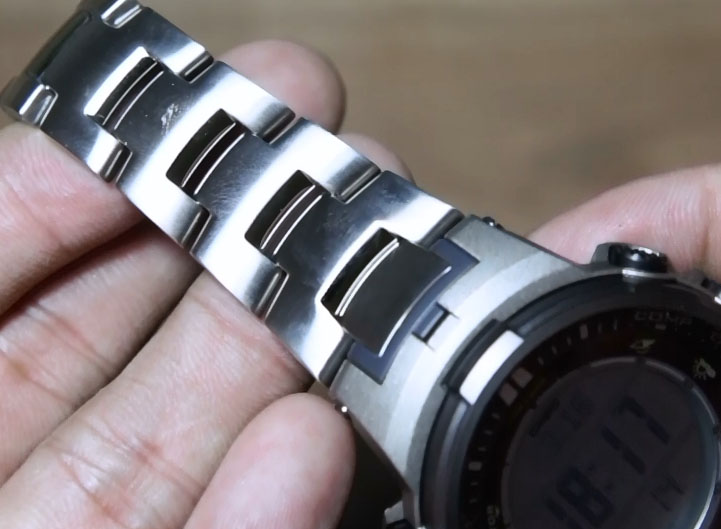 Untuk membuka / mengunci titanium band jam ini pada pergelangan tangan Anda cukup gampang dan cepat, Casio menyediakan fitur double lock, 1 press, 3 fold clasp pada jam Casio Protrek PRW-3000T ini. Penggunaan fitur lock ini diyakini lebih kuat dan mampu mencegah terlepasnya lock pada jam ini meskipun melakukan aktivitas cukup ekstrim. Pertama Anda harus “mencungkil” bagian paling luar yang memiliki logo protrek, setelah itu Anda tinggal menekan “kunci” kedua pada kedua sisi titanium band ini dan kemudian merenggangkan 3 flod clasp tersebut.